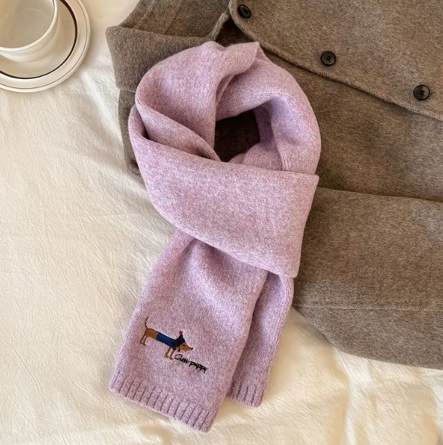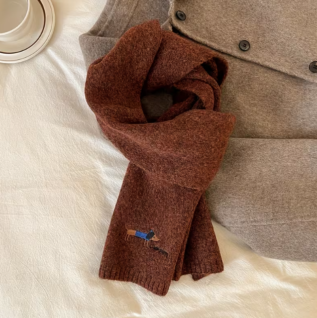 Deze leuke warme sjaal omarmt je met de vreugde van een boswandeling. De diepe mooie warme tinten roepen beelden op van weelderige bladeren en een serene natuur, waardoor deze sjaals perfect zijn voor de herfst en winter. De geborduurde teckel voegt een speelse charme toe, waardoor de sjaal een uniek accent krijgt. Gemaakt van luxueuze zachte wol met mohair,  biedt deze sjaal niet alleen warmte, maar voelt ook heerlijk aan tegen de huid.