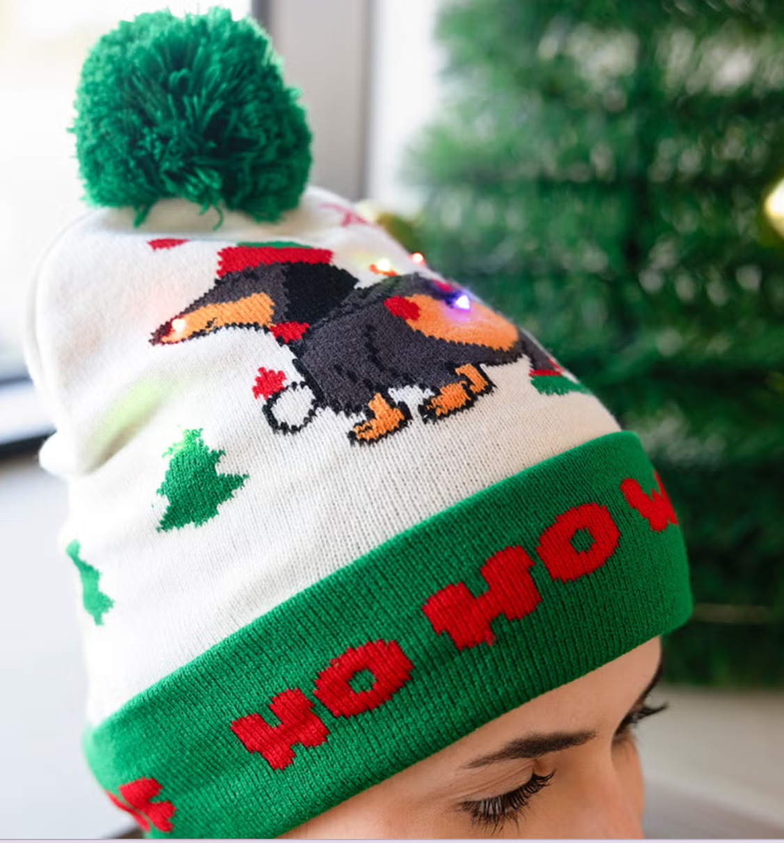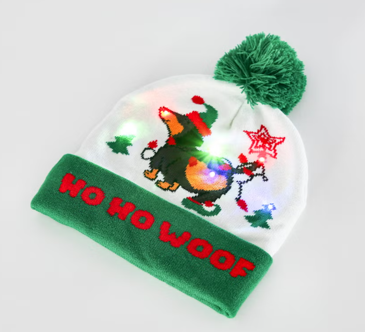 Zeker weten dat niemand zo een leuke muts draagt! Druk op het knopje en de lampjes in de muts bij de teckel gaan flikkeren!! je kunt de lampjes in # standen zetten!
