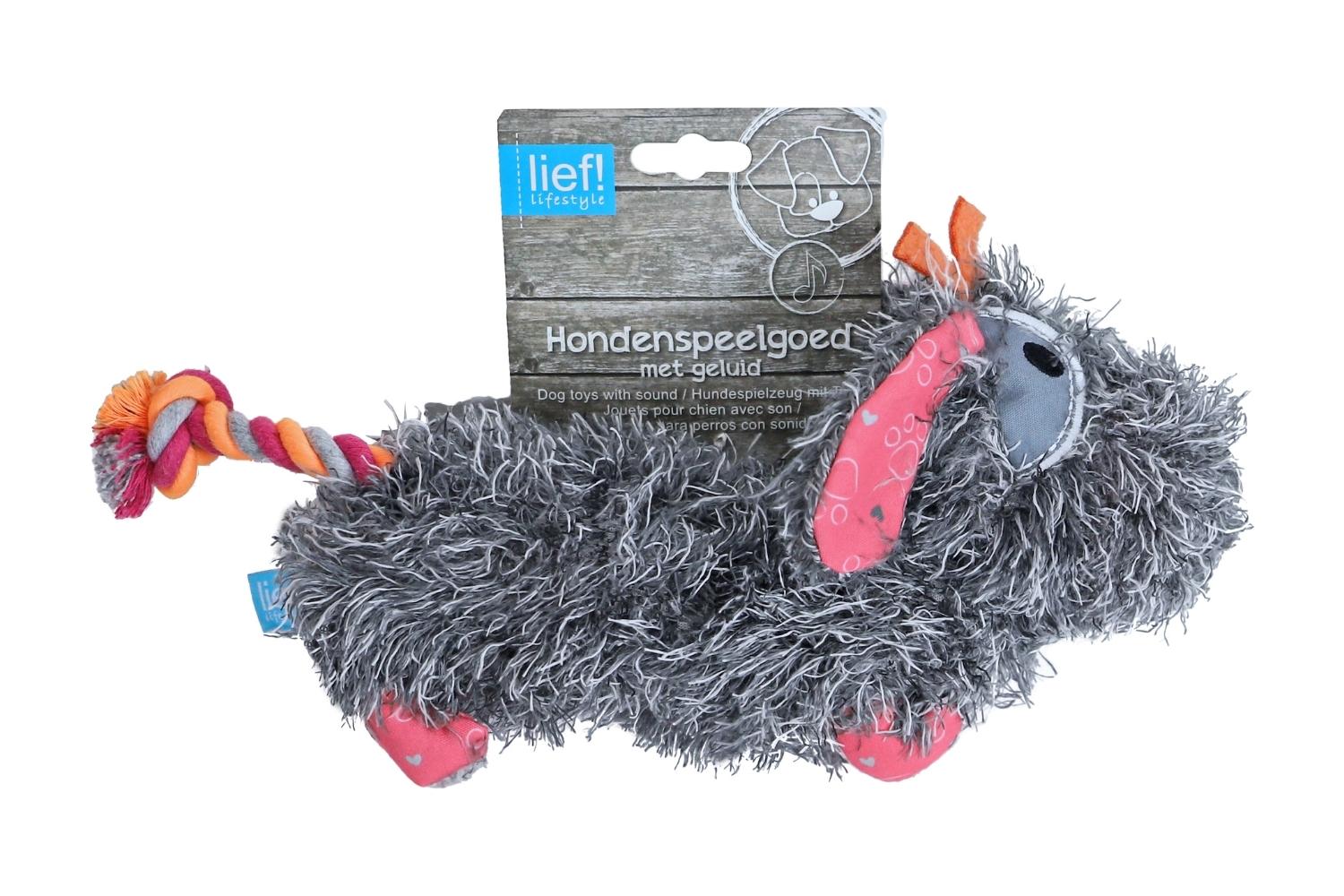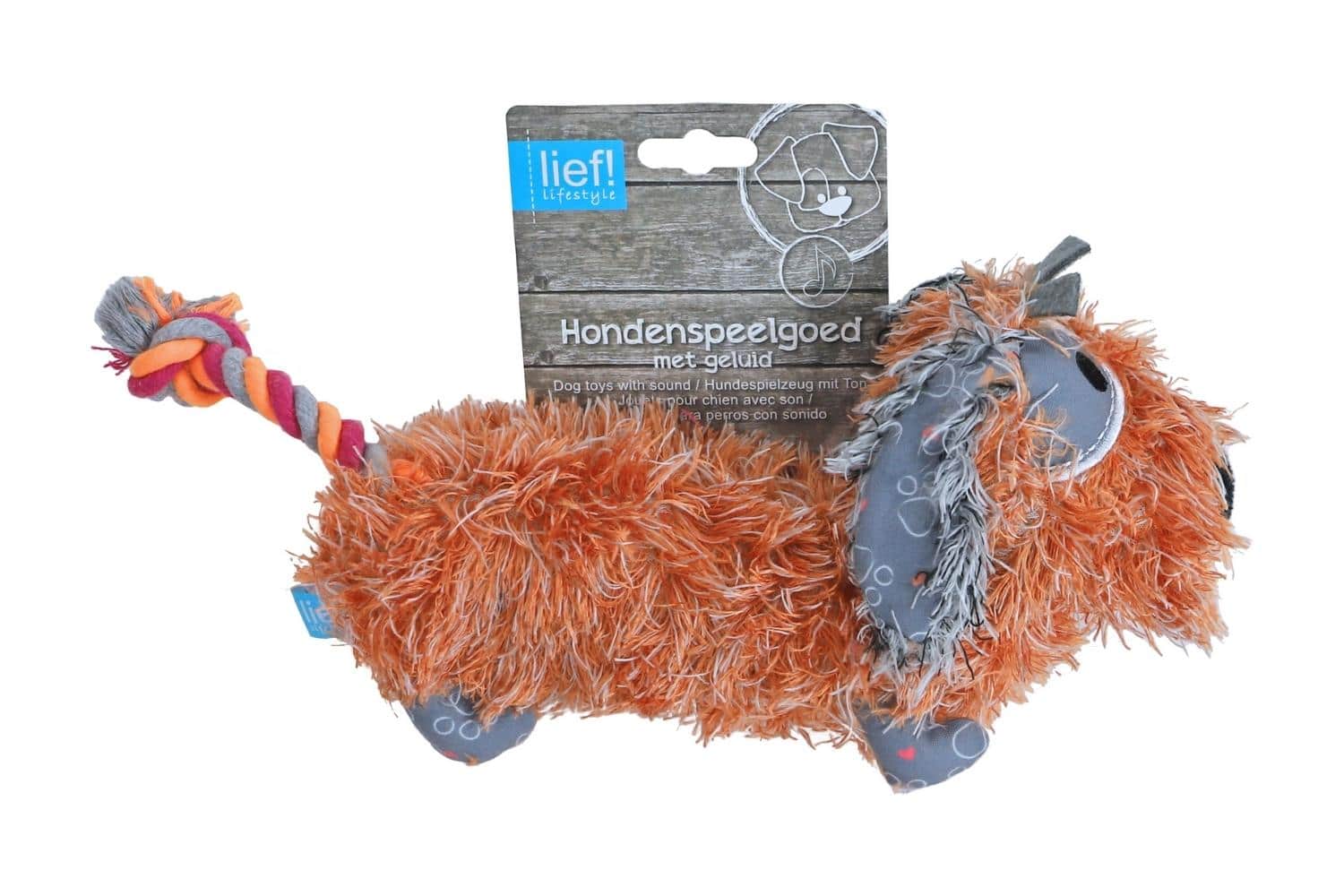 Deze schattige knuffel ziet eruit als een ruwharige teckel! Met zijn speelse uitstraling en gezellige details brengt hij meteen plezier in huis. Verkrijgbaar in drie vrolijke kleuren, waardoor er altijd eentje perfect bij jouw stijl past. Deze knuffel heeft een leuke piep die voor extra speelplezier zorgt en een stevig trekkoord staart dat uitdraagt tot de leukste speelavonturen. Perfect om mee te knuffelen, te spelen en je beste vriend te worden!
