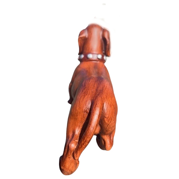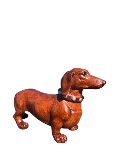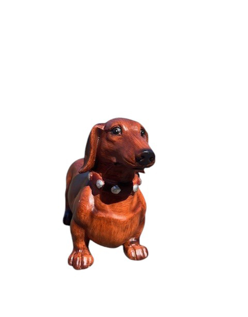 Deze charmante teckel straalt warmte en karakter uit met zijn gedetailleerde afwerking.  De fijne textuur en subtiele nuances in de kleur geven de teckel een levensecht uiterlijk, alsof hij net van ambachtelijke hout of chocolade gemaakt is.