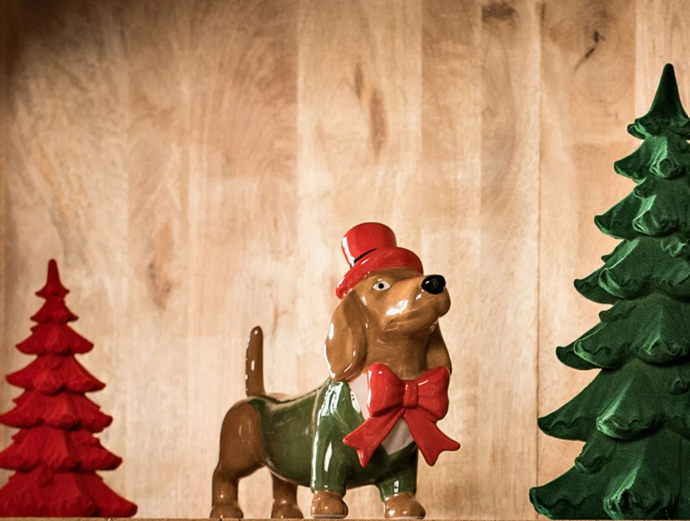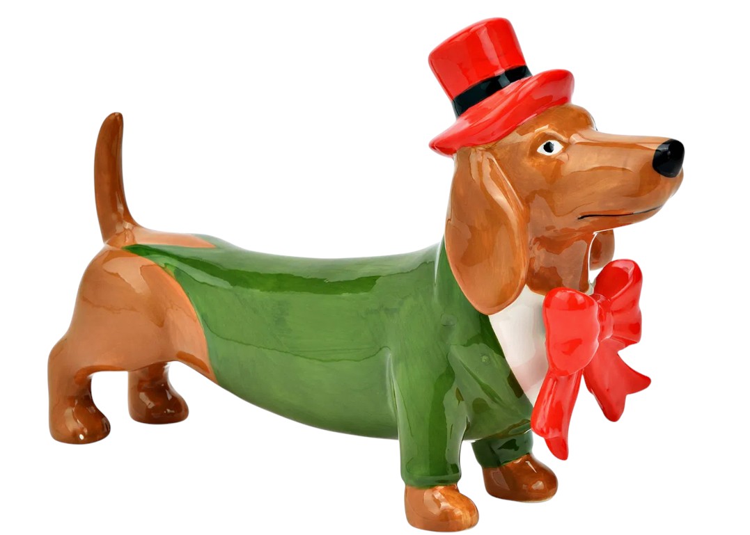 Deze vrolijke keramieken teckel in kerstsfeer is met zijn glanzende afwerking in een groen jasje met rode strik en hoed helemaal klaar om onder de boom te staan of perfect als mooie tafeldecoratie of cadeau aan de échte teckel lover! (23x15x6cm)