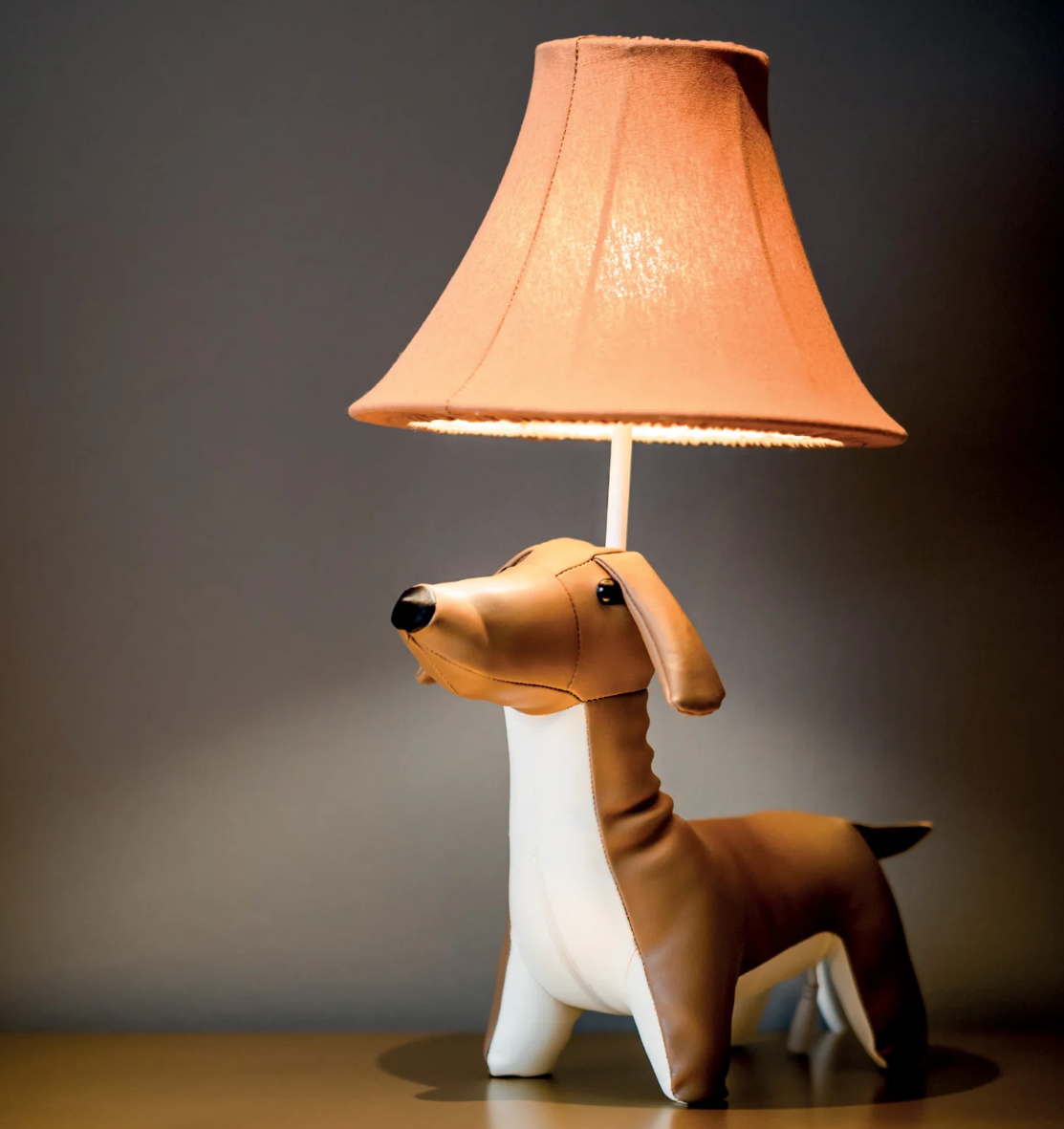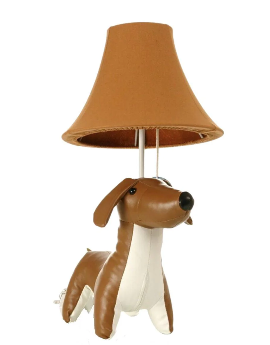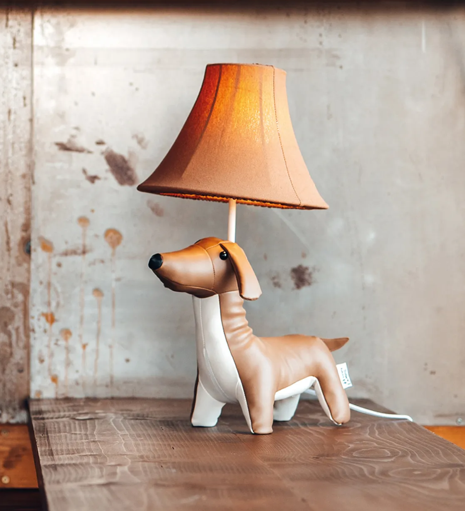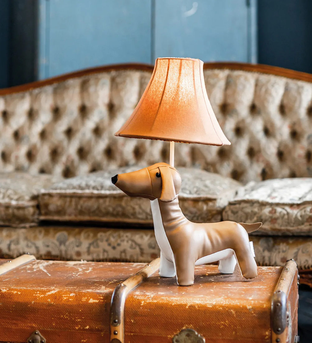 Unieke superleuke teckel tafellamp! De lamp is ontworpen in de charmante vorm van een elegante lederen teckel, vervaardigd uit hoogwaardig, leer dat een luxe uitstraling geeft. De gedetailleerde afwerking en natuurlijke textuur maken het een kunstwerk op zich. De lamp wordt compleet gemaakt door een speelse, sfeervolle lampenkap die perfect past bij de speelse en verfijnde uitstraling van de teckel. Een prachtige toevoeging voor iedere woonkamer, kantoor of speelse kinderkamer – een combinatie van design, kwaliteit en gezelligheid!